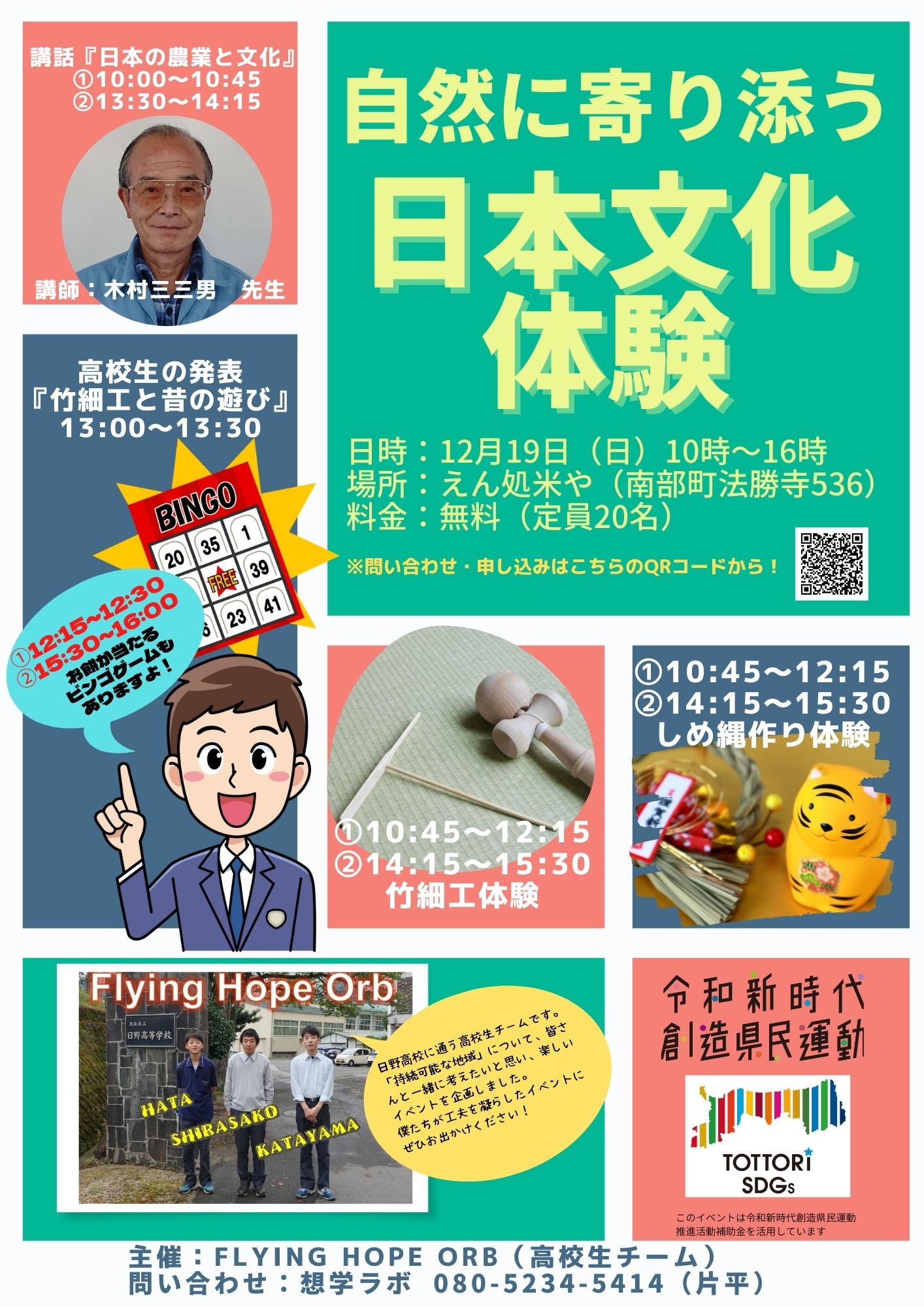 高校生3名のチーム「FLYING HOPE ORB(FHO)」が、地域の皆さんと協力しながイベントを開催します。農業文化を題材に、祖先の知恵を体験するイベントを企画し、しめ縄と竹とんぼづくりを体験しながら、日本人ならではの「自然と折り合いをつける知恵」に迫ります。また、イベントでは、農業の専門家による講話や高校生が考えた「農家の知恵」に基づくビンゴゲーム、高校生による発表会なども行います。