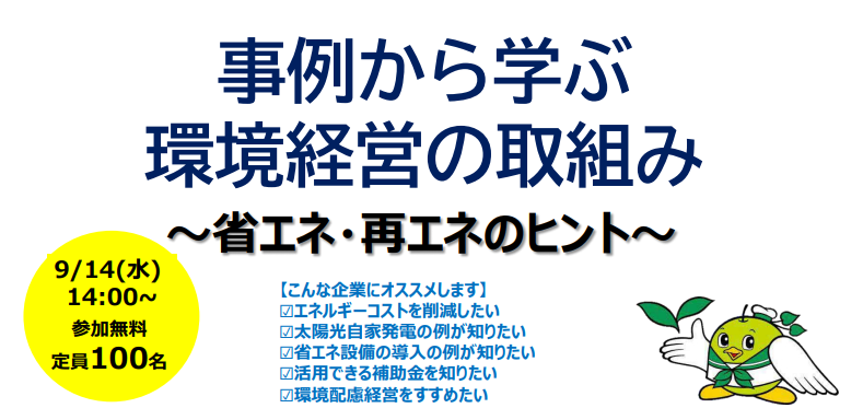 【9/13正午締切】省エネ・再エネの導入事例紹介のセミナーを開催します