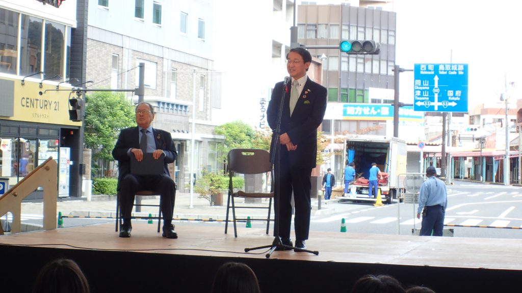 鳥取市立久松小学校6年生と鳥取商工会議所女性会が協力し若桜街道へのフラッグを掲出。